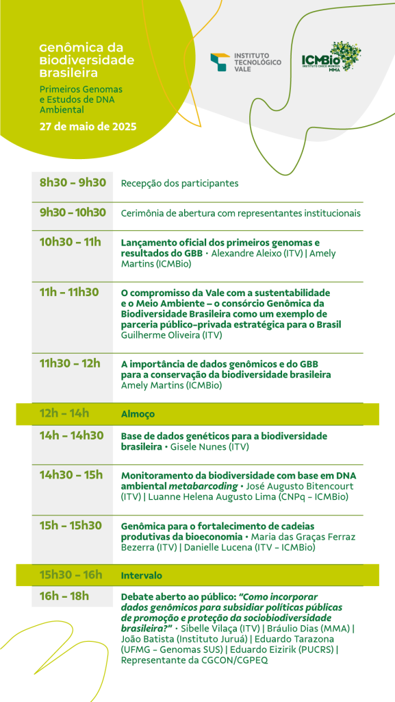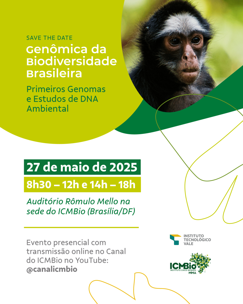 No dia 27 de maio de 2025, na sede do ICMBio em Brasília (DF), será realizado um evento presencial, gratuito e aberto ao público para apresentar os primeiros genomas e resultados do projeto Genômica da Biodiversidade Brasileira (GBB). Este projeto é fruto de uma parceria entre o Instituto Tecnológico Vale (ITV) e o Instituto Chico Mendes de Conservação da Biodiversidade (ICMBio).